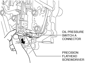 8.Insert a precision flathead screwdriver and move it in the direction of the arrow to disconnect the oil pressure switch A connector as shown in the figure.