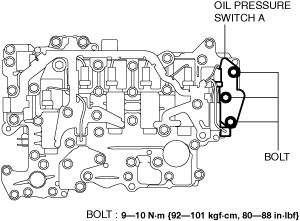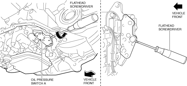 10.Insert a flathead screwdriver as shown in the figure and remove oil pressure switch A from the control valve body while avoiding contact with the oil pan installation surface.