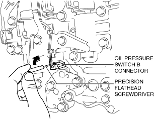 • Do not scratch the oil pressure switch B and oil pressure switch connector B with the precision flathead screwdriver.• When disconnecting connectors, grasp the connectors, not the wiring harnesses. Otherwise, the wiring harnesses may be pulled out of the connector causing poor contact.