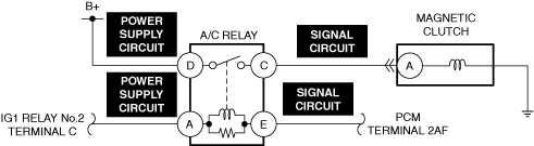 • Short circuit between A/C relay terminal E (A/C control signal) and ground.