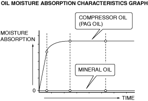 • Compressor oil (PAG oil) has a higher moisture absorption efficiency than the previously used mineral oil. If moisture mixes with the compressor oil, the refrigerant system could be damaged. Therefore, install caps immediately after using the compressor oil or removing refrigerant system parts to prevent moisture absorption.