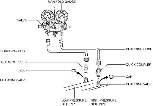 2.Connect the charging hoses to the high- and low-pressure side joints of the manifold gauge.