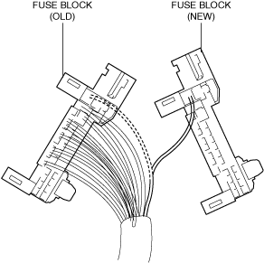 • When replacing the fuse block, it is necessary to switch terminals from the fuse block terminal prior to replacement to the fuse block terminal on the replacement. When switching terminals, ready the replacement fuse block before pulling out the terminal of the fuse block prior to replacement. This is because it is necessary to switch the terminals one at a time so that the installation positions are not mistaken.