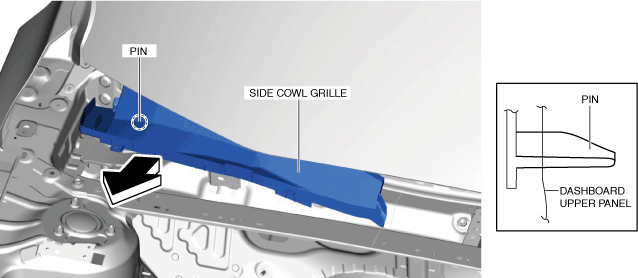 (3)Pull the side cowl grille in the direction of the arrow shown in the figure while pulling out the pin.