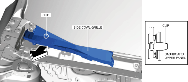 (4)Remove the side cowl grille in the direction of the arrow shown in the figure while detaching the clip from the dashboard upper panel.