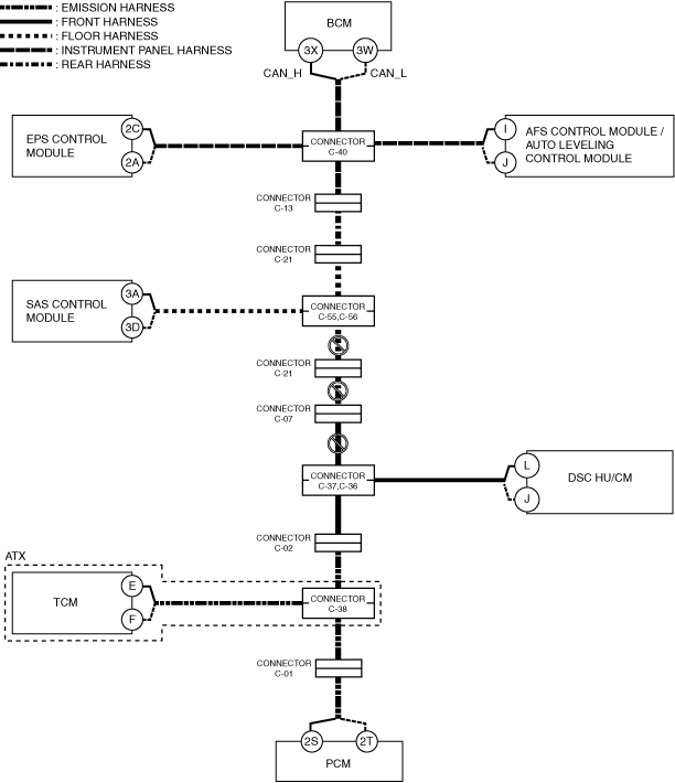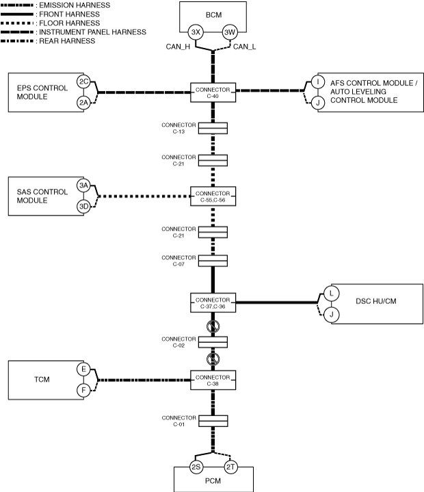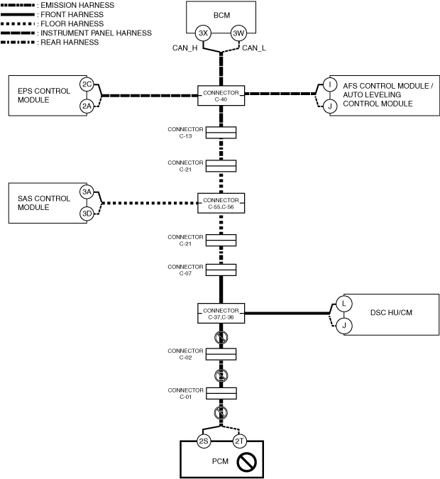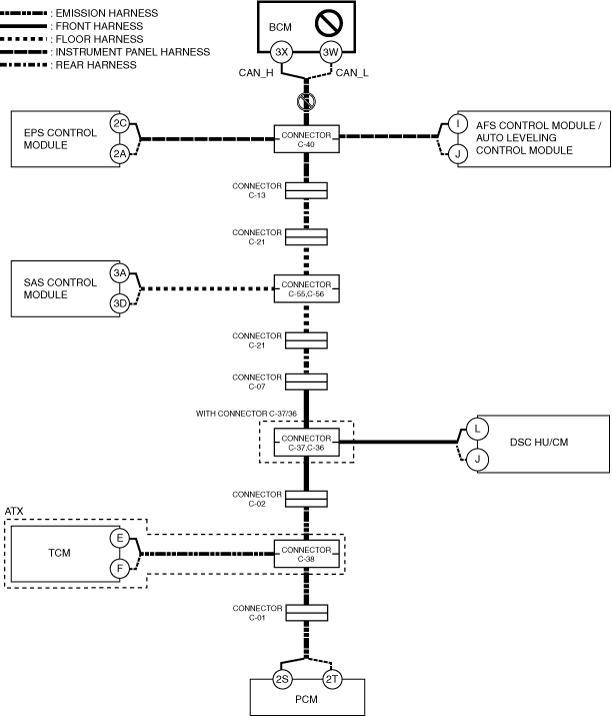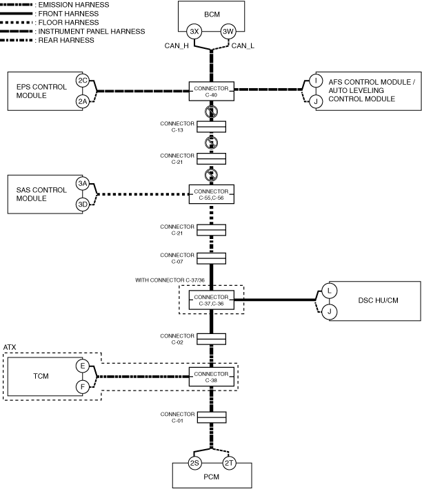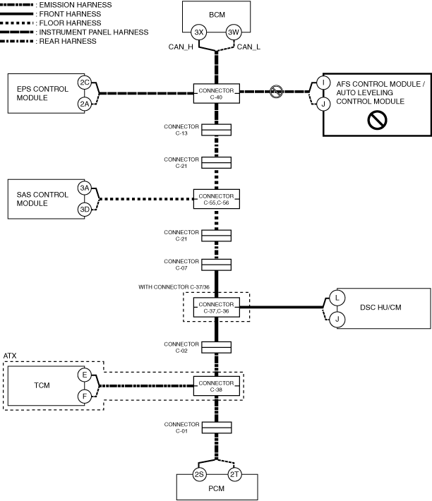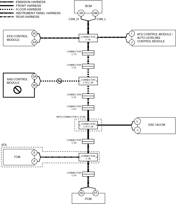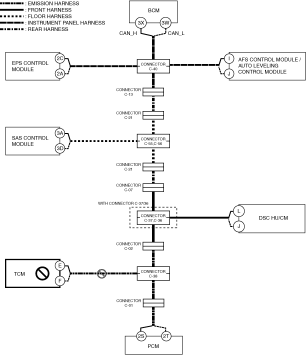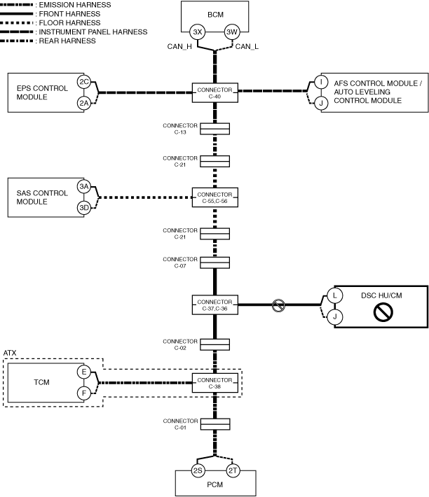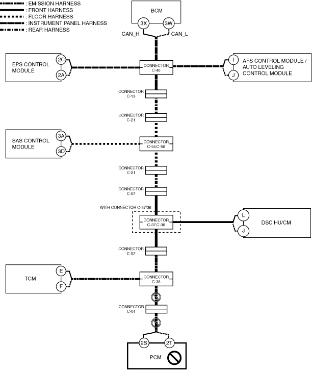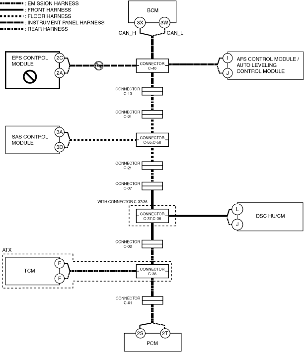 • Wiring harness between DSC HU/CM terminal L and connectors C-37, C-36