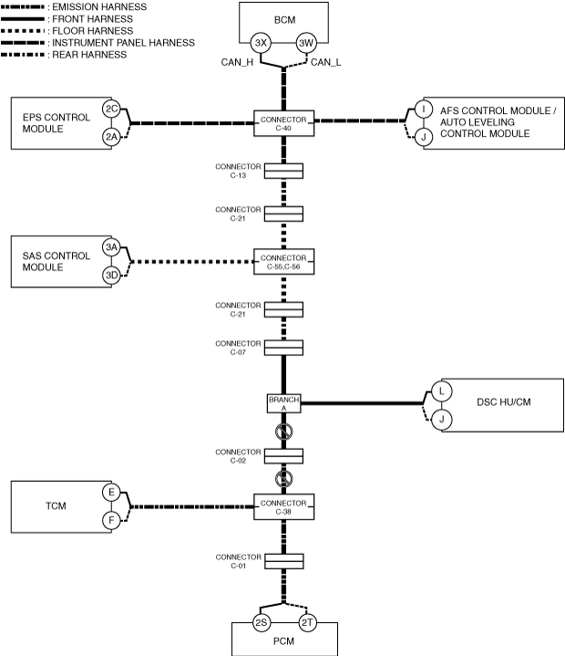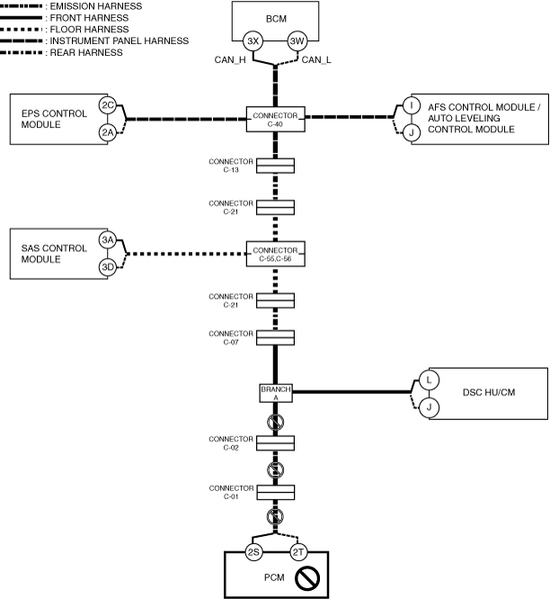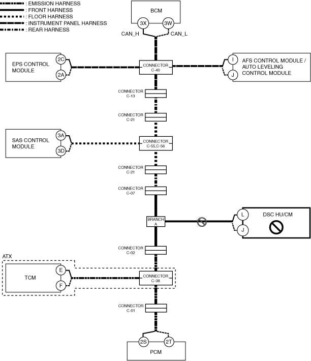 • Wiring harness between DSC HU/CM terminal L and branch A