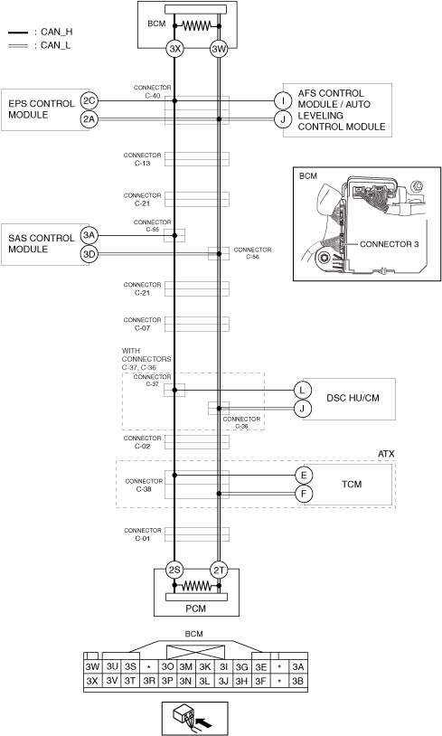 • Disconnect the connector 3 which has body control module (BCM) terminals 3X and 3W.