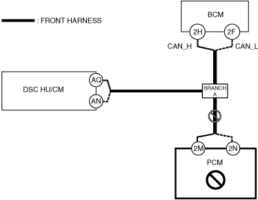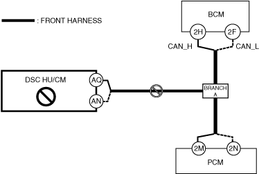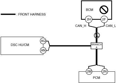 • Connector terminal disconnection, poor contact, damage, deformation, corrosion• DSC HU/CM power supply voltage or body ground malfunction• Open circuit in wiring harness between DSC HU/CM and branch A• DSC HU/CM malfunction