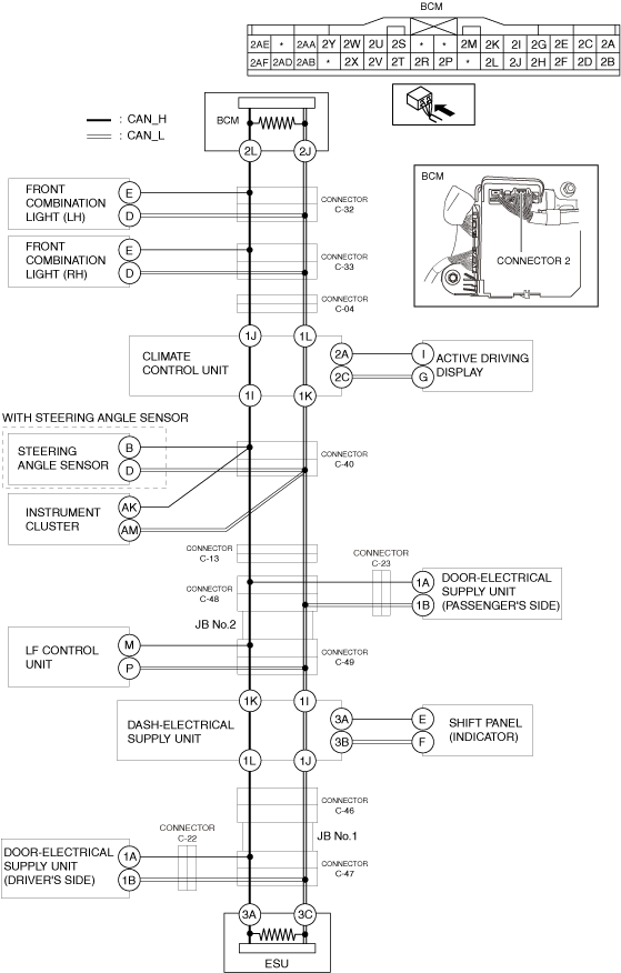 • Disconnect the connector 2 which has body control module (BCM) terminals 2L and 2J.