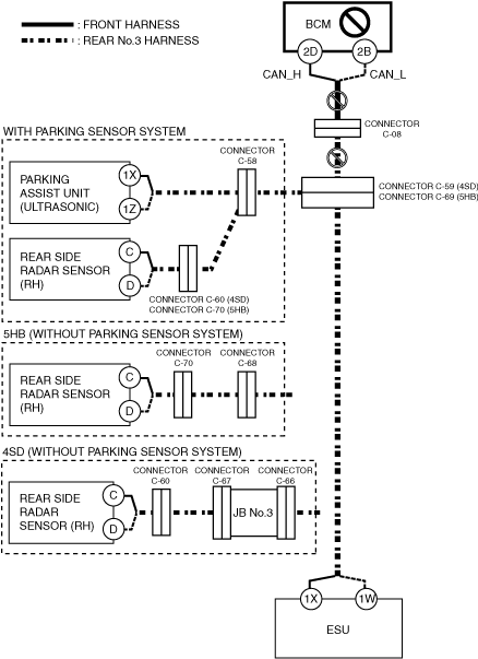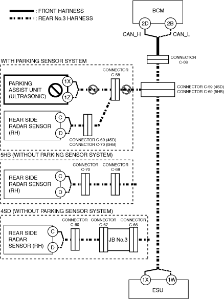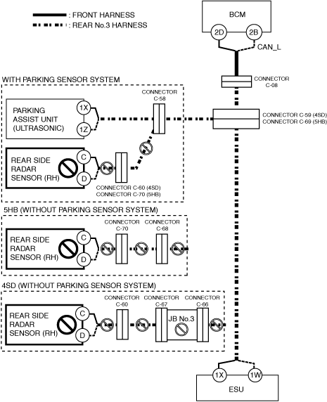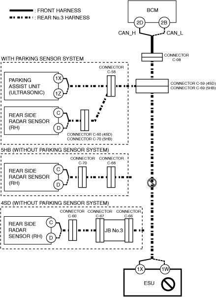 • Rear side radar sensor (RH) power supply voltage-related wiring harness and fuse• Rear side radar sensor (RH) body ground related wiring harness• Rear side radar sensor (RH) connector• Connector C-59 (4SD)• Connector C-69 (5HB)• Connector C-60 (4SD)• Connector C-70 (5HB)• Connector C-58 (with parking sensor system)• Connector C-68 (5HB (without parking sensor system))• Connector C-66 (4SD (without parking sensor system))• Connector C-67 (4SD (without parking sensor system))• Wiring harness between rear side radar sensor (RH) and connector C-60 (4SD)• Wiring harness between rear side radar sensor (RH) and connector C-70 (5HB)• Wiring harness between connector C-60 and connector C-58 (4SD (with parking sensor system))• Wiring harness between connector C-70 and connector C-58 (5HB (with parking sensor system))• Wiring harness between connector C-70 and connector C-68 (5HB (without parking sensor system))• Wiring harness between connector C-68 and connector C-69 (5HB (without parking sensor system))• Wiring harness between connector C-60 and connector C-67 (4SD (without parking sensor system))• JB No.3 (4SD (without parking sensor system))• Wiring harness between connector C-66 and connector C-59 (4SD (without parking sensor system))• rear side radar sensor (RH)