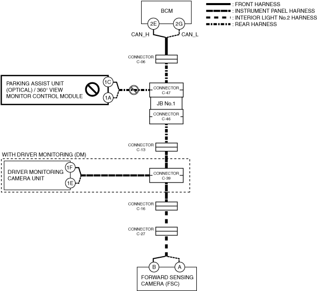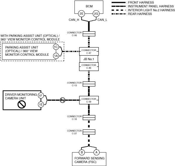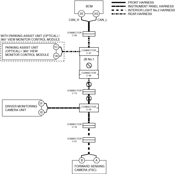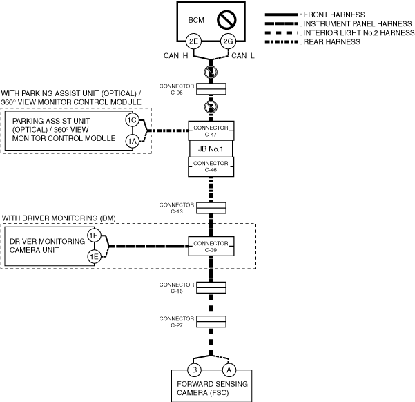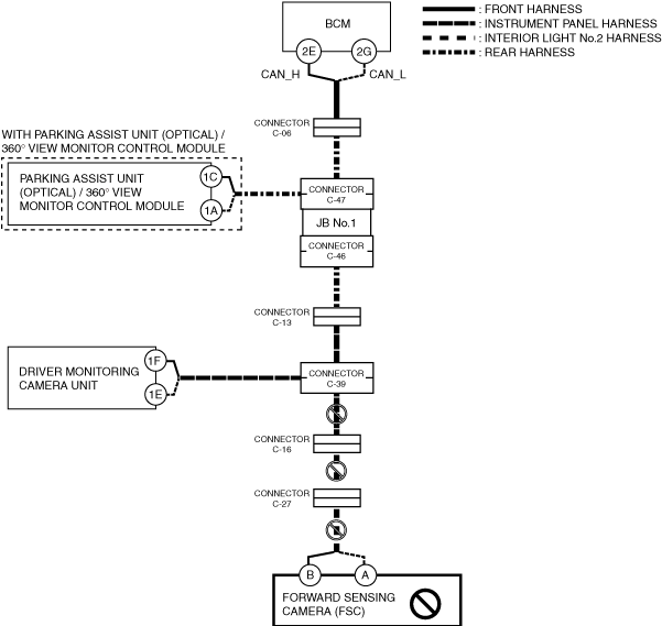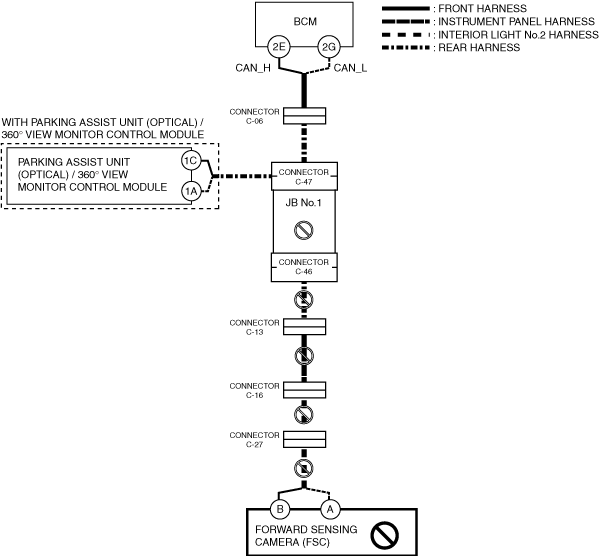 • Forward sensing camera (FSC) power supply voltage-related wiring harness and fuse• Forward sensing camera (FSC) body ground related wiring harness• Forward sensing camera (FSC) connector• Connector C-27• Connector C-16• Connector C-13• Connector C-46• Wiring harness between forward sensing camera (FSC) terminal B and connector C-27• Wiring harness between forward sensing camera (FSC) terminal A and connector C-27• Wiring harness between connector C-27 and connector C-16• Wiring harness between connector C-16 and connector C-13• Wiring harness between connector C-13 and connector C-46• JB No.1• Forward sensing camera (FSC)