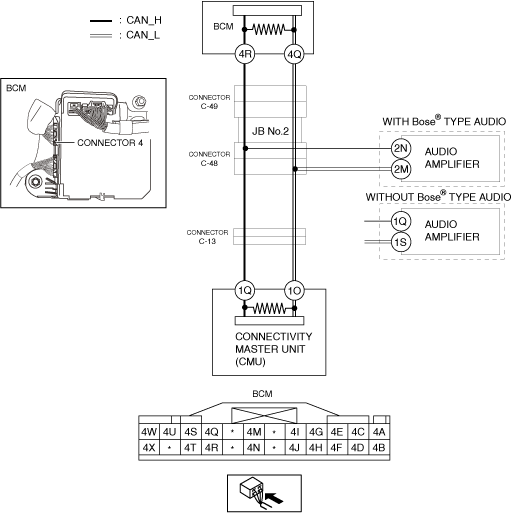 • Disconnect the connector 4 which has body control module (BCM) terminals 4R and 4Q.