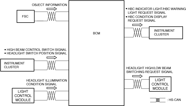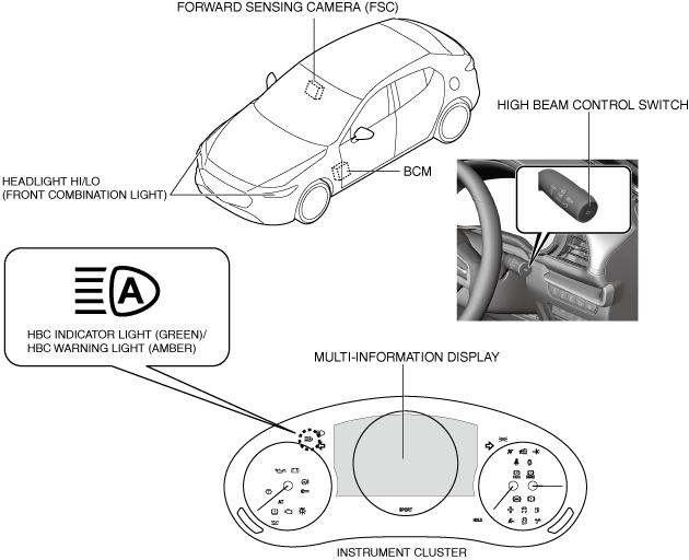 • The body control module (BCM) displays the system status using the HBC indicator light (green), HBC warning light (amber), and multi-information display in the instrument cluster.