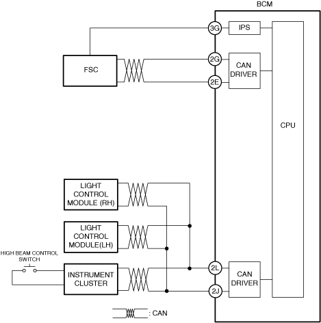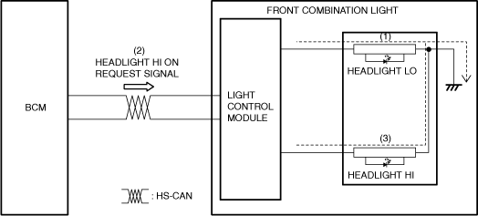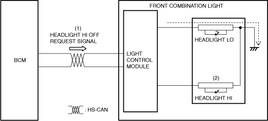 1. When any of the operation conditions are met, the body control module (BCM) sends (1) a headlight HI off request signal to the light control module (LCM) by using CAN communication.