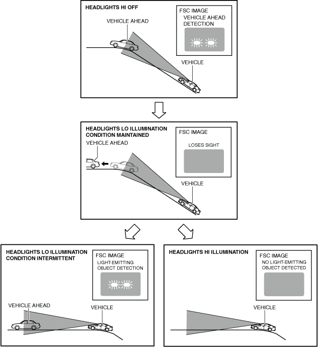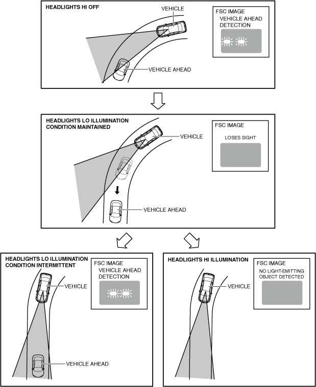 • If the vehicle ahead is not detected at the locus at which the forward sensing camera (FSC) had lost sight of it, the headlights HI are turned on. If the vehicle ahead is detected, the headlights LO on condition is maintained.
