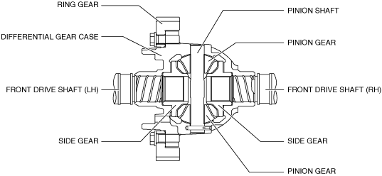 • The side gears are engaged with the front drive shaft (LH) and front drive shaft (RH) and rotates as a single unit for each.