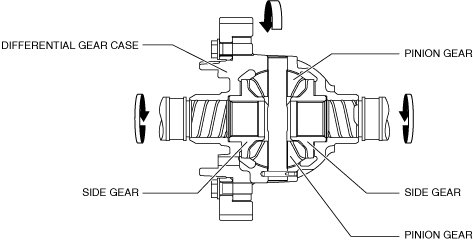 • If there is no difference in rotation speed between the left and right driving wheels, the left and right side gears rotate together with the differential gear case and pinion gears.