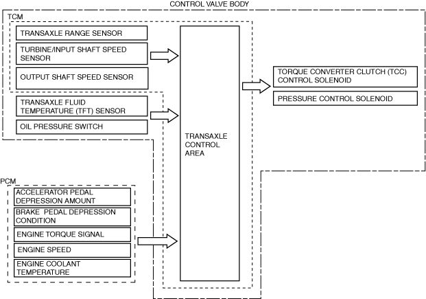 • A current signal is sent from the TCM to the TCC control solenoid during TCC release. At the same time, the TCC piston engagement pressure is gradually drained.