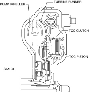 • The TCC mechanism consists of a torque converter clutch, TCC piston, and a damper which are installed inside the torque converter.
