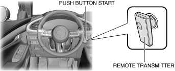 • The coil antenna is integrated with the push button start.• By touching the center area of the emblem on the remote transmitter to the center area of the push button start, the coil antenna reads the key code from the transponder integrated with the remote transmitter.