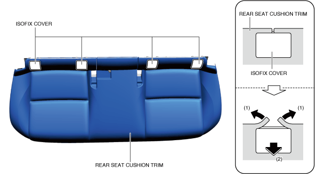 2.Pull the edges of the rear seat trim in the directions of arrows (1) shown in the figure and remove the ISOFIX covers in the direction of arrow (2).