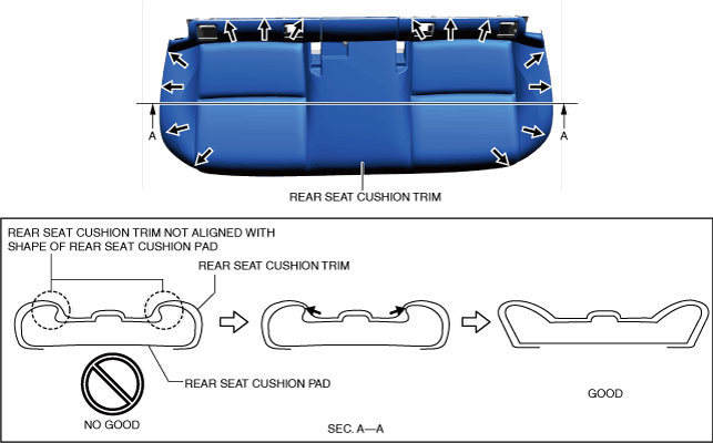 4.Align the rear seat cushion trim with the shape of the rear seat cushion pad while pressing the rear seat cushion pad outward.