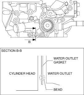 1.Install the water outlet gasket with the bead of the gasket facing the direction shown in the figure.