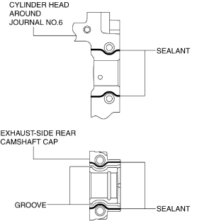 • To prevent engine oil leakage, apply sealant around journal No.6 of the cylinder head or the rear camshaft cap on the exhaust side, and seal the journal.