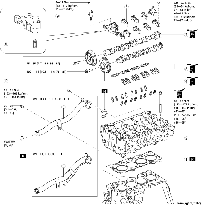 Electric variable valve timing actuator (intake side): 102—114 N·m {10.5—11.6 kgf·m, 76—84 ft·lbf}Hydraulic variable valve timing actuator (exhaust side): 75—85 N·m {7.7—8.6 kgf·m, 56—62 ft·lbf}