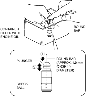 - (2)While lightly pressing the check ball using a round bar ( approx. 1.0 mm {0.039 in} diameter), bleed air by moving the plunger up and down.