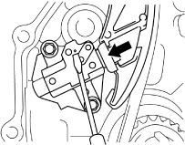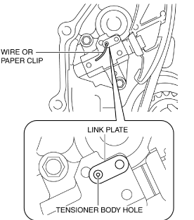6.Insert a wire with an approx. diameter of 1.5 mm {0.059 in} or a paper clip where the link plate hole and the tensioner body hole overlap to secure the link plate and lock the plunger. (Chain tensioner (type A))
