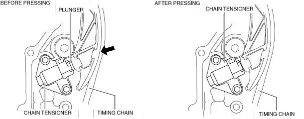 - (3)Press the timing chain in the direction of the arrow and press in the chain tensioner plunger to the position where the groove and body hole are aligned.