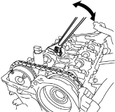 2.While moving the exhaust camshaft back and forth in the direction of the arrow using a wrench on the cast hexagon, press down the link plate of the timing chain tensioner using a precision screwdriver and release the plunger lock. (Chain tensioner (type A))