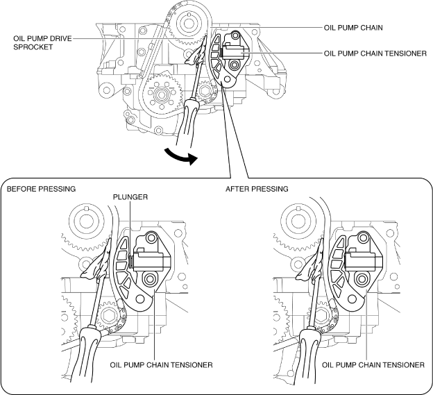 4.Move the screwdriver in the direction of the arrow and press the oil pump chain, and then press on the plunger of the oil pump chain tensioner.