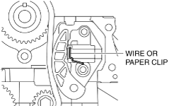 5.Insert a wire with an approx. diameter of 1.4 mm {0.055 in} or a paper clip into the body hole of the oil pump chain tensioner with the plunger pressed.