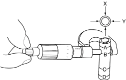 1.Measure the piston pin outer diameter using the micrometer. Measurement positions total eight and are in the X and Y directions, at four points (A, B, C, and D) as shown in the figure.