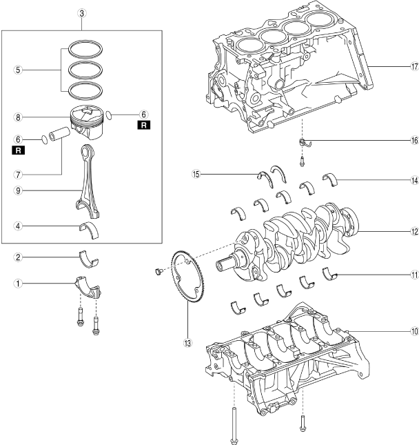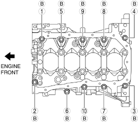 2.Loosen the lower cylinder block installation bolts B in two or three passes in the order shown in the figure and remove them.