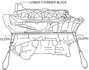 4.Using a screwdriver wrapped in a cloth, peel the sealant away a little at a time, and remove the lower cylinder block.