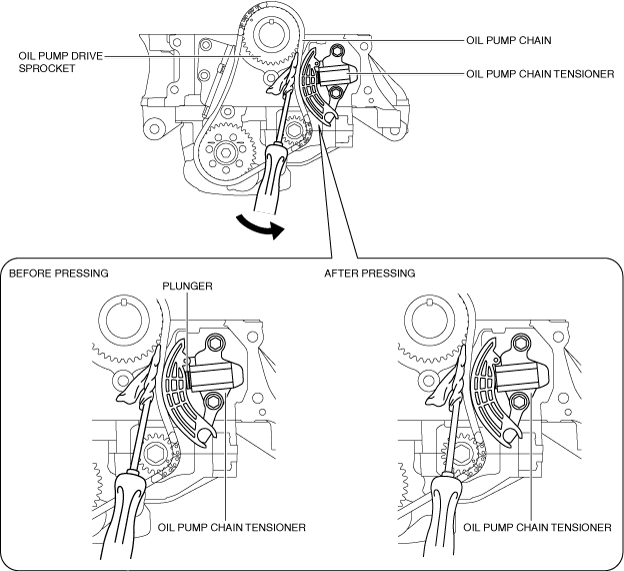 4.Move the screwdriver in the direction of the arrow and press the oil pump chain, and then press in the plunger of the oil pump chain tensioner.