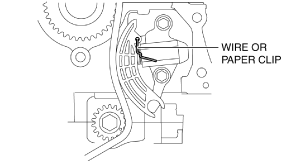 5.Insert a wire with an approx. diameter of 1.4 mm {0.055 in} or a paper clip into the body hole of the oil pump chain tensioner with the plunger pressed.