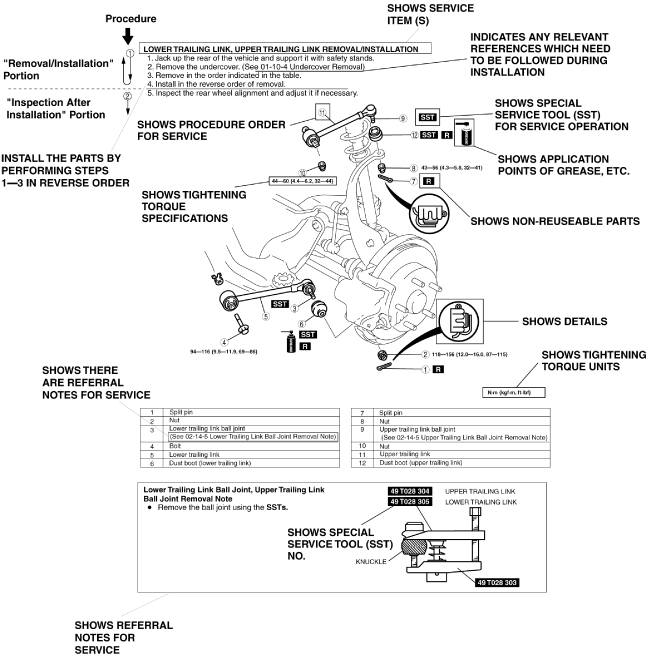 2.Expendable parts, tightening torques, and symbols for oil, grease, and sealant are shown in the overview illustration. In addition, symbols indicating parts requiring the use of special service tools or equivalent are also shown.