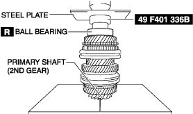 1.Set the primary shaft component, new ball bearing, SST, and an appropriate steel plate in a press as shown in the figure.