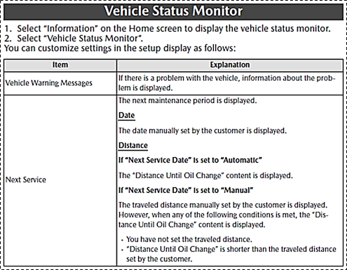 - The “Next Service Date” setting under Vehicle Status Monitor in the center display changes to “Manual” by itself after being set to “Automatic” and even with the “Manual” setting in the display, the internal calculation works as if set to “Automatic”. The “Engine oil change” message is then displayed when the oil deterioration level reaches the threshold. This is caused by a communication error between the PCM, BCM and CMU.