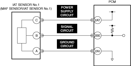 • When there is an internal malfunction in IAT sensor No.1, the MAF sensor/IAT sensor No.1 sends a malfunction signal to the PCM. When the PCM receives a malfunction signal from the MAF sensor/IAT sensor No.1, the MAF sensor/IAT sensor No.1 determines an internal malfunction and stores a DTC. In addition, when the PCM receives a value other than the preset standard for the output value from IAT sensor No.1 continuously, the PCM determines that there is an internal malfunction in the MAF sensor/IAT sensor No.1 and stores a DTC.