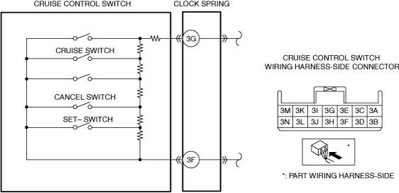 4.Measure the resistance between clock spring terminals 3F and 3G (part wiring harness-side) using a tester.