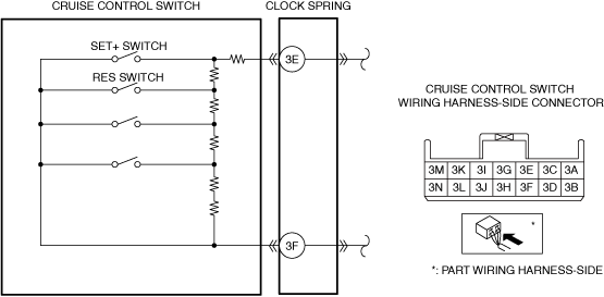 5.Measure the resistance between clock spring terminals 3E and 3F (part wiring harness-side) using a tester.