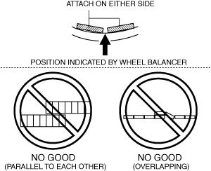 • Completely attach the balance weight by pressing it with 25 N {2.5 kgf, 5.6 lbf} or more of force per 5 g {0.2 oz} for 2 s or more.• Do not install four or more weights. (VIN: Except 3M **)• Do not install three or more weights. (VIN: 3M **)• Do not attach the balance weights in parallel or stack them.• One weight is 120 g {4.23 oz} or less and three weights are 160 g {5.64 oz} or less. (VIN: Except 3M **)• One weight is 120 g {4.23 oz} or less and two weights are 120 g {4.23 oz} or less. (VIN: 3M **)• If a weight of 125 g {4.41 oz} is to be added, divide the weight into two pieces and affix. (VIN: JM **)