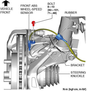 3.Disconnect the front ABS wheel-speed sensor wiring harness on the steering knuckle and set it aside so that it does not interfere with the servicing.