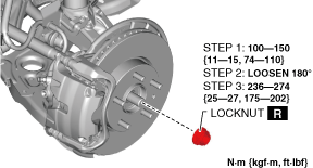 • When installing the locknut, install it manually without using an electric or pneumatic tool. Otherwise, the locknut may seize and the tightening force of the wheel hub may decrease and cause excessive play or abnormal noise.• When installing the locknut, do not apply load at the ground to the axle. Otherwise, it could damage the wheel hub.